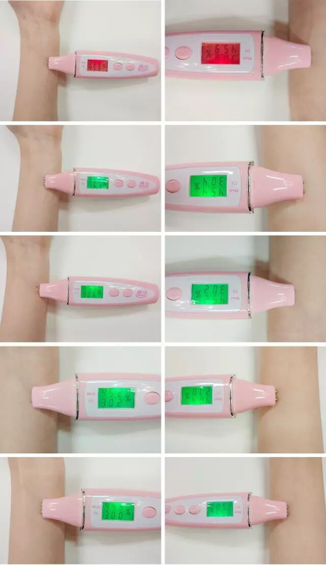 本着耳听为虚眼见为实的原则,做了一个真人测试。左手用磁力导入仪,右手直接涂抹,对比实际的保湿效果。